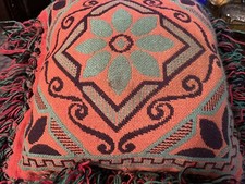 Handcrafted Needlepoint Pillow Fringed Flower Wool Boho Autumn Vtg