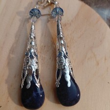 These handcrafted silver and blue Lapis Lazuli teardrop dangle earrings are a unique piece of bohemian art jewelry. These earrings feature a teardrop shape and silver metal hooks for closure. The bohemian theme and art-inspired design make these earrings a stylish accessory for women who appreciate handmade and artisan jewelry pieces. 3" long