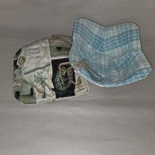 Set of two reversible bowl cozies. Made of 100% cotton for safe use in microwave. One side is country truck pattern with blue accent. Reverse side is a blue plaid.