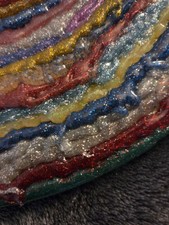 Included in this two piece set of Handmade by Becka pieces are a clear glass vase is approximately 5x5x4 in size and a gold plate 13 inch round. I have covered these pieces in multicolored glitter hot glue. These are one of a kind pieces with no possibility that your friends and family will have ever seen art like this. These are handwash only. Do not use around heat as they are made with hot glue that will remelt and destroy the pieces. Thank you for your interest. I would be willing to make custom pieces and colors of your choice upon request. Feel free to contact me with any questions. Have a fantastic day.