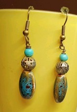 Handmade Dangle Beaded Earrings In Brown And Turquoise Tones