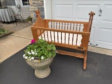 This handmade oak rocking baby cradle with wheels is a charming and unique addition to any nursery or collectibles collection. Made of wood in a rich oak color, this cradle was crafted in the United States, showcasing quality craftsmanship and attention to detail. The addition of wheels allows for easy mobility while still maintaining a stable and secure environment for a baby to gently rock to sleep. Perfect for those looking to add a touch of rustic elegance to their home; sure to enhance any nursery. In excellent condition!