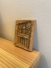 Handmade terracotta decorative tile featuring a relief design of the Petra Treasury façade in Jordan. Solid clay with natural aged patina and artisan craftsmanship. Decorative piece intended for wall or shelf display. Good condition with light wear consistent with handmade production.