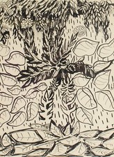 This abstract work depicts a dense array of plants, leaves, flowers, and vines. Harry Hilson was active from the 1950s-2000. He created a variety of works, including oil paintings, ink drawings, wool tapestries, and more.