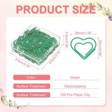 Questo set di fermagli a forma di cuore in metallo è progettato per elevare l'organizzazione e lo stile. Ideali per uffici o case, i fermagli aggiungono un tocco decorativo fissando in modo sicuro documenti, lavori artigianali o foto. Usali come segnalibri, decorazioni per album o abbellimenti per regali per un appeal versatile.Specifiche:Colore: Verde;Materiale: Metallo; Superficiale: Rivestimento In Plastica;Forma Fermagli: Cuore;Dimensione Fermagli: 25 x 30mm / 0.98 x 1.18 pollici (L*P);Dimensione Scatola: 9.5 x 9.5 x 2.5cm / 3.74 x 3.74 x 0.98 pollici (L*P*H);Lista Imballaggio: 100 x Fermaglio, 1 x Scatola Di PlasticaVantaggi:Realizzati in metallo con rivestimento, questi fermagli resistono alla ruggine, garantendo un uso a lungo termine.