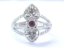 Here is a Fine Double Heart Shape Diamond White Gold Ring. What a masterpiece! Made from Solid 14KT White Gold and weighs 6.5 grams. It holds 1 Natural Heart Shape Diamond that weighs 1.20Ct, 1 Natural Heart Shape Diamond that weighs. 75Ct, 1 Natural Ruby that weighs. 15Ct, 6 Natural Baguette Diamonds that weigh. 36Ct, 40 Natural Round Brilliant Diamonds that weigh. 25Ct, and are all F Color VS2 Clarity!