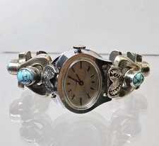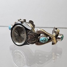 This listing is for the gorgeous vintage sterling silver sandcast turquoise watch cuff shown in the photos. The cup will fit a size 5.5 inch wrist and has an overall weight of 70 G. It currently has a Timex watch in it that is mechanical and running.
