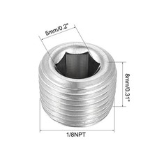 Specification:Product Name: Hex Counter Sunk PlugThread Size: 1/8NPTThread Length : 8mm/0.31-inchInternal Hex Width : 5mm/0.2-inchMaterial: Stainless SteelColor: Silver ToneOperating temperature:-20 - 100 Degree Celsius Package Content :5pcs x Hex Counter Sunk Plug Description:1.This hex drive countersunk plug is a iron pipe fitting with male NPT threads.2.The countersunk plug with a hex drive inserts into a pipe or fitting to close and terminate its end and has a recessed hex head for increased bearing load.3.It has male National Pipe Taper (NPT) threads for connecting to female threaded pipes, creating a tighter seal than straight threads.4.This fitting is made of iron for corrosion resistance, ductility at high temperatures, and low magnetic permeability.
