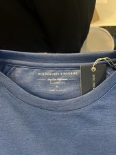 Featuring a modern heathered pattern and our distinctive tailored fit, The Betts crewneck was designed for both sport and lifestyle wear. It was also designed for performance, with excellent moisture wicking thanks to a lightweight synthetic blend construction. Finished with an athletic raglan-sleeve construction and tonal H&B back yoke logo. 95% polyester, 5% spandex. Color is a heathered blue, size medium.