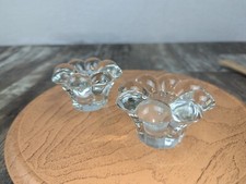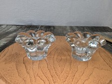 This is a set of two decorative taper candle holders made of crystal clear glass. Each holder features a flower design, perfect for adding a touch of elegance to any home decor. Very nice condition. No chips or cracks The candles holders weigh 10 oz a piece Fast fair shipping