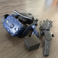 Used condition has some wear seen on headset speakers. HTC Vive pro headset and 1.0 base stations with power cables. Has Vive wireless adapter piece and 1 Vive controller. Does not have wires to link box or complete adapter kit.