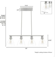 The Hunter Van Nuys 4-Light Brushed Linear Chandelier with Clear Glass is a stylish and elegant lighting fixture designed for indoor use in rooms like the kitchen or dining room. With a brushed nickel finish and clear glass shades, this chandelier adds a touch of sophistication to any space. This hardwired chandelier operates at 120V and has a width of 32 inches, making it a versatile and beautiful addition to your home decor.