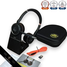 This Jabra Evolve 75 is a professional Stereo wireless headset featuring world-class speakers and Active Noise Cancellation (ANC). It includes the original Charging Stand and Link 370 USB adapter for seamless PC connectivity.