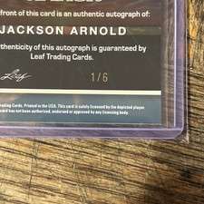 The product is a signed and numbered sports trading card featuring football player Jackson Arnold. Produced by Leaf in 2025, this card is a rare find as it is numbered 1 out of 6. It is in near mint or better condition, making it a valuable addition for collectors and fans of the sport. The card symbolizes a new dawn for the player and is a unique piece for enthusiasts of football trading cards.
