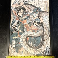 Japanese Multi-Color Paper Print Framed Warrior and Serpent Motif