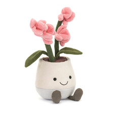 Amuseables Pink Orchid brightens up any room! Bold pink flowers with pale orange columns sit on sturdy, suedette stalks with matching leaves, all nestled in a pot of fuzzy cocoa soil. In a trendy, two-tone pot, this sweet orchid has charcoal fine cord legs, and a big, stitched smile to bring joy wherever it sits.