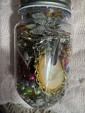 This jar is full of rings, earrings, a watch that works, necklaces and bracelets. They are all wearable, no junk. All the earrings have their match. It’s jar full of fun.