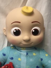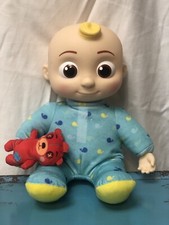 JJ Cocomelon Singing Bedtime Push chest Laughs Says time to go to bed Sings 13” x 9.5” Plush Operates on 3 AAA Batteries ( included in doll ) In Good Preowned Condition Small dark mark on side of head ( shown in photo ) PJs have a small flaw ( shown in photos ) Clean