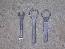 A very nice set of Kawasaki Motorcycle wrenches. The open end wrench is made by H-M and is 10mm and 14 mm. The smaller closed end wrench is 27mm and the larger on is 32mm.