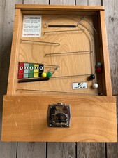 T is a 1958 Keeney Scramball. This nickel --05 cent-- machine was used at bars and taverns for gambling purposes. After a coin is inserted, the colored ball's are dropped to a shooting lever in the lower right corner.