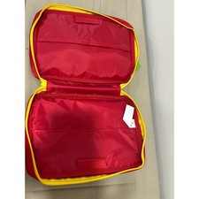 Medium-sized VeggieTales book and Bible cover featuring the characters Bob the Tomato and Larry the Cucumber. Size: Medium, designed to fit books or Bibles measuring approximately 6 1/8" x 8 13/15". Design: Red exterior with yellow piping and a yellow carry handle. Storage: Includes a zippered back pocket and interior pen holders.