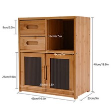 Application It suits many occasions, like home kitchen, dining room, hallway, living room, office, break room, restaurant, and so on to place kitchen items such as tableware, glass jars, microwave donkeys, spices, seasonings, and daily necessities such as books, photo albums, pens, documents, etc. Specification Color: Wood color Shape: Rectangular Mounting Type: Floor Mount Assembly Required: Yes Material: Bamboo, Acrylic Finish: Painting Each Tier Load-bearing Capacity: About 7.5-10kg/16.5-22 lbs Drawer Load-bearing Capacity: About 2.5kg/5.5 lbs Thickness: About 12mm/0.47in Product Size: 42*23*48cm/16.5*9*18.9in Drawer Height: 9cm/3.5in Open Tier Size(L*H): 18*19cm/7*7.5in Bottom Tier Size(L*H): 39*25cm/16.5*9.8in Package Included 1* Storage Cabinet 1* Glove.