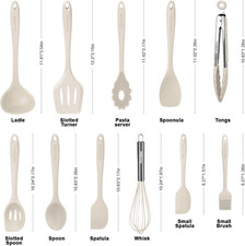 The High Quality Kitchen Utensils Includes :1 x Pasta Fork, 1 x Brush, 1 x Tongs, 1 x Spoon, 1 x Slotted Spoon, 1 x large Spatula, 1x Slotted turner, 1 x ladle, 1 x Baking Spoonula,1x Whisk, 1x small Spatula.