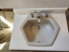@ Koler porcelain sinks with counters, one blue, one gray, with faucets and pipe