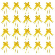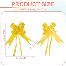 Pull bows are perfect decorations all year round. They are suitable for gift box wrapping, flower wrapping, wedding table decoration, and Christmas decoration, and they can also be used for Valentine's Day, New Year's Day, Graduation, Wedding, Birthday, Mother's Day, Valentine's Day, and so on.SpecificationColor: YellowMaterial: PlasticUnfolded Size: 15x9 cm/5.91x3.54 Inch(LxW)Packing List: 20 Pcs x Large Gift BowAdvantageThe bows for gift wrapping are assembled into a beautiful flower shape that makes your gift stand out! It will sparkle in the light and look elegant and charming.InstructionThe gift bows for presents are easy to make and assemble. Hold the two thin ribbons in the center and pull on the two wide bows to form a beautiful bow.Note: If you want to reuse the bow, you need to keep the two thin ribbons and do not cut them.