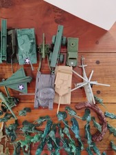 Approximately 124 green and tan army men along with 8 tanks Barricades 2 planes Helicopter 2 jeeps and odds and ends Very large nice lot
