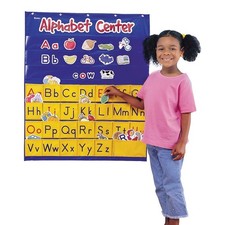 Practice letter and sound identification, word building, spelling and more. The 34"L x 28"W chart has 3 clear pocket rows for card display, 26 letter pockets and an extra storage pocket. Includes 52 letter cards, 156 picture cards(picture one side, word on the other) and activity guide. Easy to clean nylon.