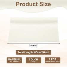 The leather repair patch kit is suitable for couches, vinyl furniture, car seats, recliners, sofas, chairs, cabinets, walls, bags, purses, boots, down jackets, driver seats, and travel bags. It offers a practical solution for covering damage like scratches, holes, cigarette burns, tears, or scuffs.SpecificationMaterial: PVC LeatherThickness: 0.5 mm / 0.02 inchTotal Size: 25 x 60 cm / 10 x 24 inch (L*W)Packing List: 2 x Leather Repair PatchAdvantageThe leather repair patch consists of quality synthetic leather that is gentle on the skin and durable. They are waterproof, oil-resistant, heat-resistant, and wear-resistant with long-lasting adhesive properties, providing you with peace of mind when using them.InstructionEasy to Use: Our repair patch comes with a self-adhesive design.