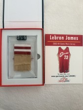 Game worn Jersey patch from LeBron James rookie season in 2003. This officially licensed item features a piece of memorabilia from the Cleveland Cavaliers player's first year in the NBA. The patch is a unique collectible piece that showcases James during his time with the team, making it a valuable item for basketball fans and collectors interested in sports memorabilia. Lebron James game worn jersey swatch sportscards