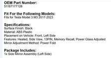 Left Side Driver Side Mirror Power Folding Black Fit for Tesla Model 3 M3 2017-2