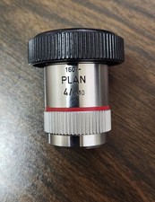 Leitz Wetzlar Plan 4x / 0.10 microscope objective. High-quality German microscope objective designed for laboratory microscopes. Specifications: • Magnification: 4x • Numerical Aperture: 0.10 • Tube length: 160 mm • Plan objective • Made in Germany Condition: Used but in good cosmetic condition. Please see photos for details. Great replacement objective for Leitz microscopes or compatible systems.