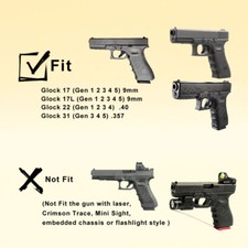 Glock 17L Gen1-3 9mmLuger. Holster fit Glock. Glock 17 Gen1-5 9mm Luger. Glock 17M 9mmLuger. Glock 17 Pro 9mmLuger. Glock 17C Gen4 9mmLuger. Glock 22 Gen1-4. 40 S&W(Not fit the Gen5). Glock 31 Gen3-5. 357 SIG.