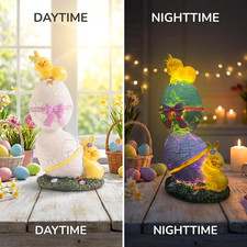 Charming Design: Set on a grassy base, the two stacked Easter eggs feature zigzag textures that glow clearly with the built-in light. Each egg includes a 3D ribbon bow, while two yellow chicks with bunny ears rest adorably against the eggs for a cheerful spring look.