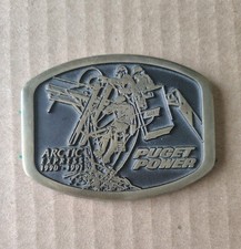 This Solid Brass Belt Buckle featuring the company Puget Power commemorating Arctic Express in the 1990-1991 era. It is a vintage accessory that pays homage to the electric industry. This original belt buckle is crafted from bronze brass in the United States, showcasing a lineman theme that reflects the rugged masculinity of adult unisex wearers. Its unique electric look adds a touch of retro flair to any outfit, making it a standout piece for those with a taste for specialty vintage items.