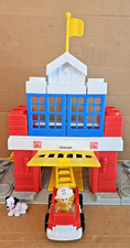Open the firehouse door to hear sirens, engine sounds, and more. Pull up in the yellow floor and the firetruck moves forward out the door! Fireman Dalmation Firetruck Ladder Hose Alarm Flag 2 window blocks 1 Peak 4 red brick blocks 2 red blocks 2 white blocks Base with firehouse door and building.