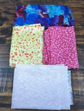 This lot of fabric includes a variety of floral and abstract patterns in vibrant colors such as yellow, pink, and blue. With a total weight of 13.9oz, it is suitable for quilting and crafts projects. The fabric is sold by the pound and features a beautiful theme of flowers and plants, making it an ideal choice for creating intricate and colorful designs in your projects.