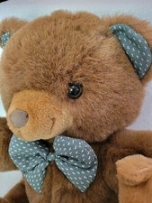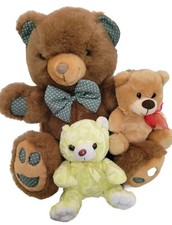 This product is a lot of three plush teddy bears in various sizes (16 inches, 6 inches, 6 inches). These teddy bears would make a charming addition to any collection or a delightful gift for all occasions. The brown teddy bear with the green bowtie has a flaw to one ear. It looks like the fur was cut in a small area. His nose has a little wear to it. He is a beautiful soft brown bear otherwise. ****SEE PICTURES! THERE ARE CLOSE UPS!*********** Ships from a clean nonsmoking environment.