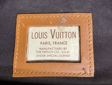 The bag has a lot of wear and tear. Zipper functions though. Needs restoration. Louis Vuitton label with a Saks Fifth Avenue metal tag as well. Approximate dimensions: 22 inches, 18 inches, 7.5 inches. Item-005