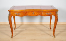 Charming rosewood veneer and gilded bronze desk. Drawer height 60cm, total height 76cm, width 120cm (+2 35cm zippers), depth 66cm. Circa 1950.