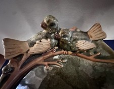 Beautiful Art Pottery Trinket / Display Dish Bowl. Green Speckle glaze with brown and tan highlights - Glossy finish with parts of birds unglazed.