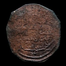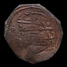 AL-ANDALUS COINS: EMIRATE. Muhammad I (238-273 H/852-886 A.D.) Bronze felus. Very fine condition. Includes handwritten collector's card, with details on the legends and even hand drawings. Very interesting.
