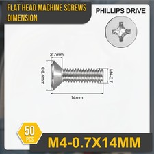 Product Details:•Color: Silver•Material: 304 stainless steel•Size: M4-0.7x14;•Screw Type: Phillips Head•Package Content: 50pcs x Flat Head ScrewMaterial - Made of 304 stainless steel, corrosion-resistant and rust-resistant, durable in harsh environment for long-time use.Feature - Flat top/ countersunk top, suitable to fasten equipment which needs to sit flush with the good appearance surface. Clear Phillips cross groove, ensure fully engage with screwdriver and avoid slippage. Smooth, and accurate threads, easy to install and improve tightness.Application - Fasten, install and maintain household appliance like electrical outlet, switch, wall plate, furniture, woodworking, and other machine maintenance in electrical industry, marine industry etc.Notice - Recommend to guide the cross grooved screw slowly locked to avoid thread slippage.