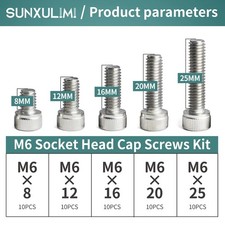 M6 x 25mm: 10 pieces. M6 x 8mm: 10 pieces. M6 x 12mm: 10 pieces. M6 x 16mm: 10 pieces. M6 x 20mm: 10 pieces. Available Lengths: 8mm, 12mm, 16mm, 20mm, 25mm (10 pieces each). Material: 304 Stainless Steel.