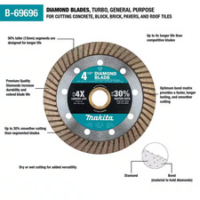 The Makita 4-1/2 in. Turbo Rim Diamond Blade is ideal for general purpose cutting applications including block, brick and cured concrete. Diamond blades are part of Makita's growing line-up of solutions for concrete applications.