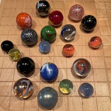 The product is a set of machine-made glass marbles that ended up in a box I took home when I retired from teaching. I’m not going to add any fancy words here. There just marbles and it didn’t seem right to throw them away. For comparison, the grid in the background are 1” x 1” squares.