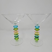 This set of 2 colorful Martini wine glasses features a unique bubble stem design, making them a stylish and decorative addition to any barware collection. The round shape and multicolor finish add a touch of elegance to any occasion, while the hand-blown glass and art deco style give them a distinctive look. Signed by the artisan, these martini glasses are dishwasher safe and perfect for all occasions, perfect for those who appreciate handmade, one-of-a-kind items. Made in the United States with a glossy finish, these glasses are a must-have for any home bar.